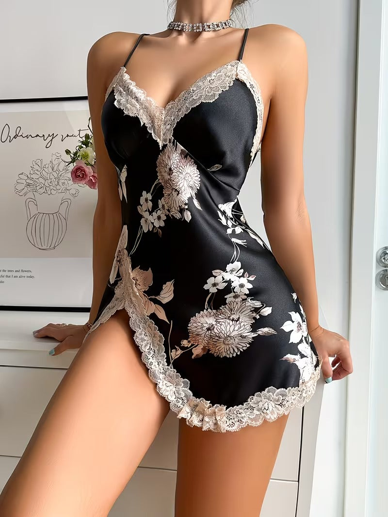 The Midnight Blossom Lace Satin Nightgown is the perfect balance of elegance and allure. Designed with a rich black satin base and adorned with delicate floral prints, this piece creates a striking yet sophisticated look. The soft champagne-toned lace trims the neckline, hem, and side slit, adding a refined romantic touch while enhancing its feminine silhouette.
