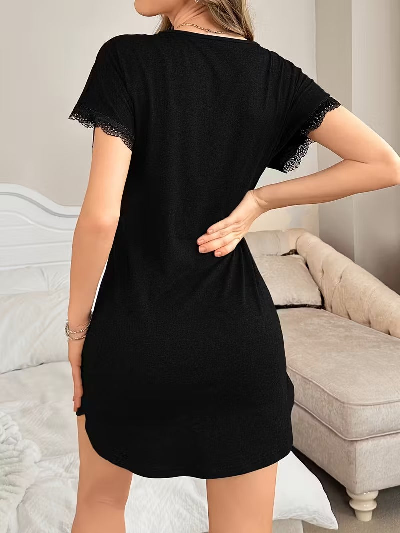 The delicate lace trim along the neckline and sleeves adds a subtle feminine detail, giving this minimalist design a refined touch. Soft, airy, and comfortable against the skin, it’s perfect for peaceful sleep, relaxed evenings, and slow mornings at home.
