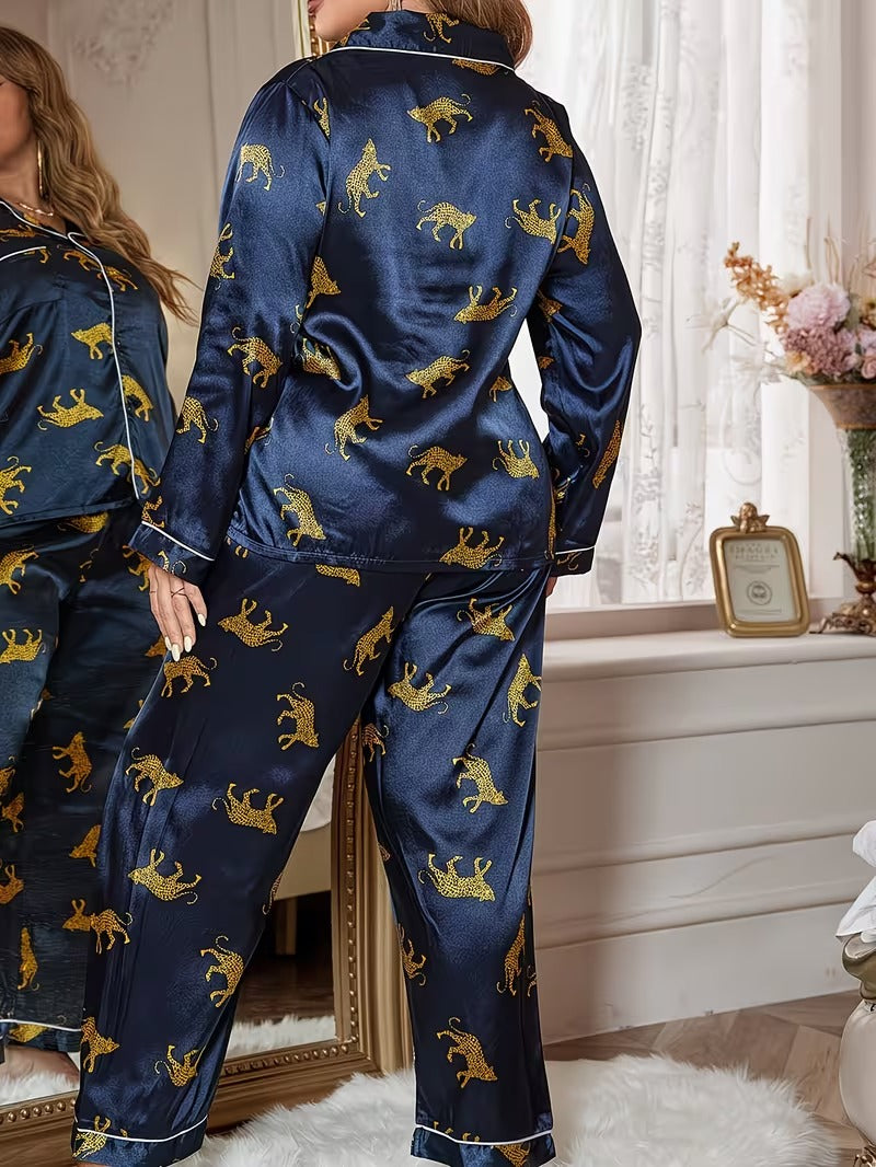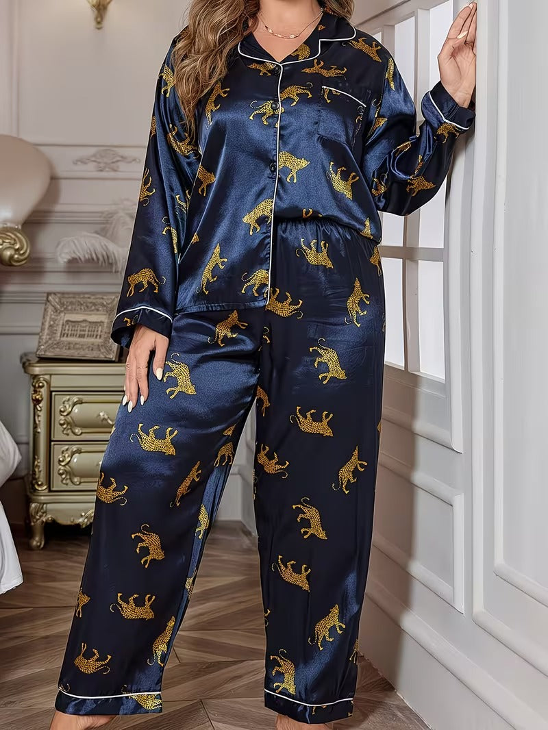 Unleash your bold elegance with the Midnight Leopard Satin Pajama Set. Designed especially for plus-size comfort and confidence, this luxurious two-piece set features a deep navy satin base adorned with striking golden leopard prints for a glamorous, eye-catching look.