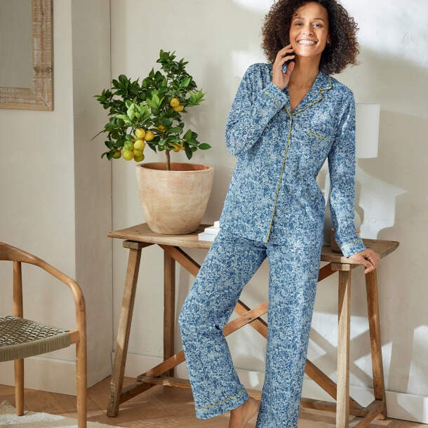 The long-sleeve button-up top features a tailored collar and elegant piping accents, while the relaxed-fit pants offer effortless movement and all-night comfort. Crafted from silky, lightweight fabric, it feels smooth against the skin and provides breathable comfort for every season.