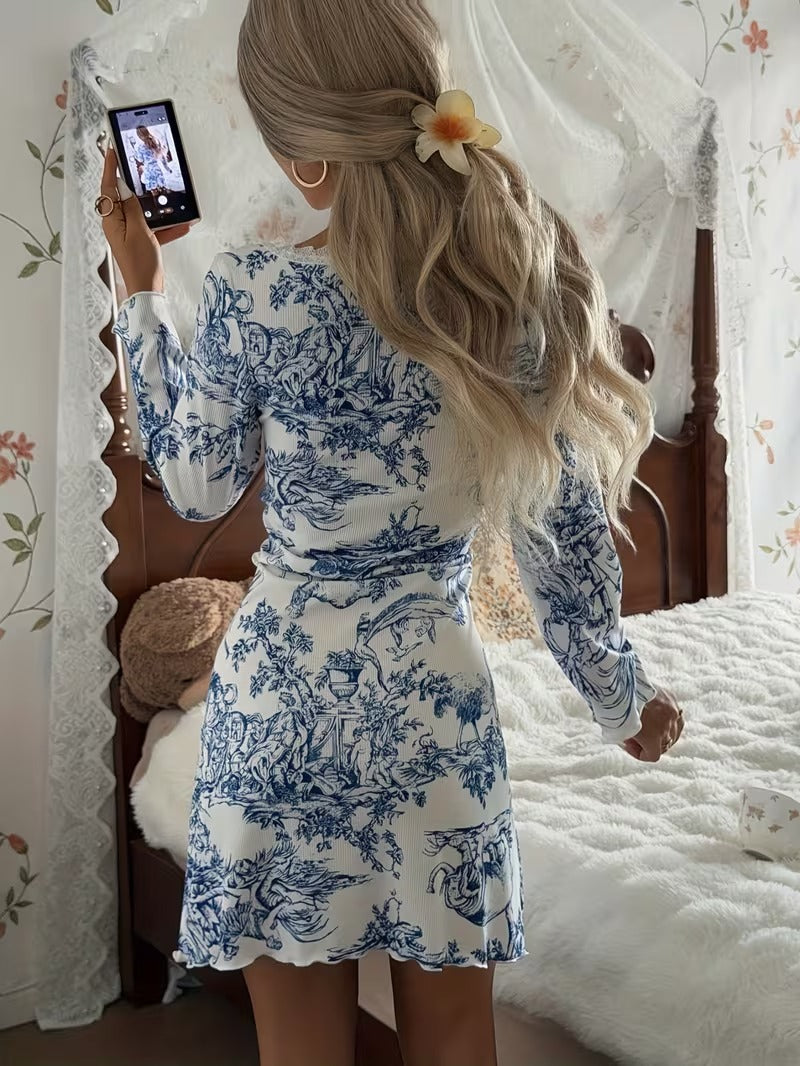 • Elegant blue toile-style print