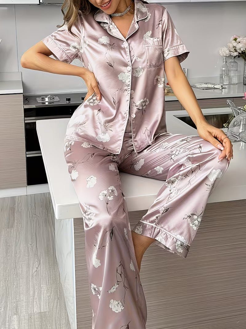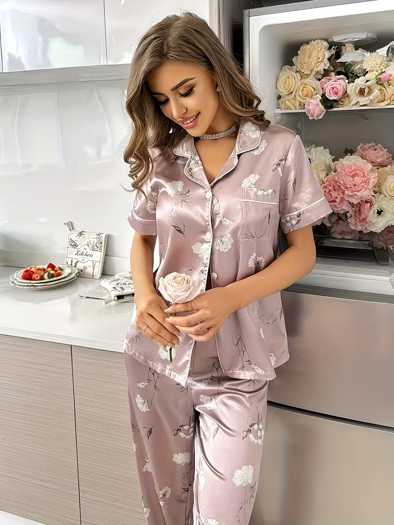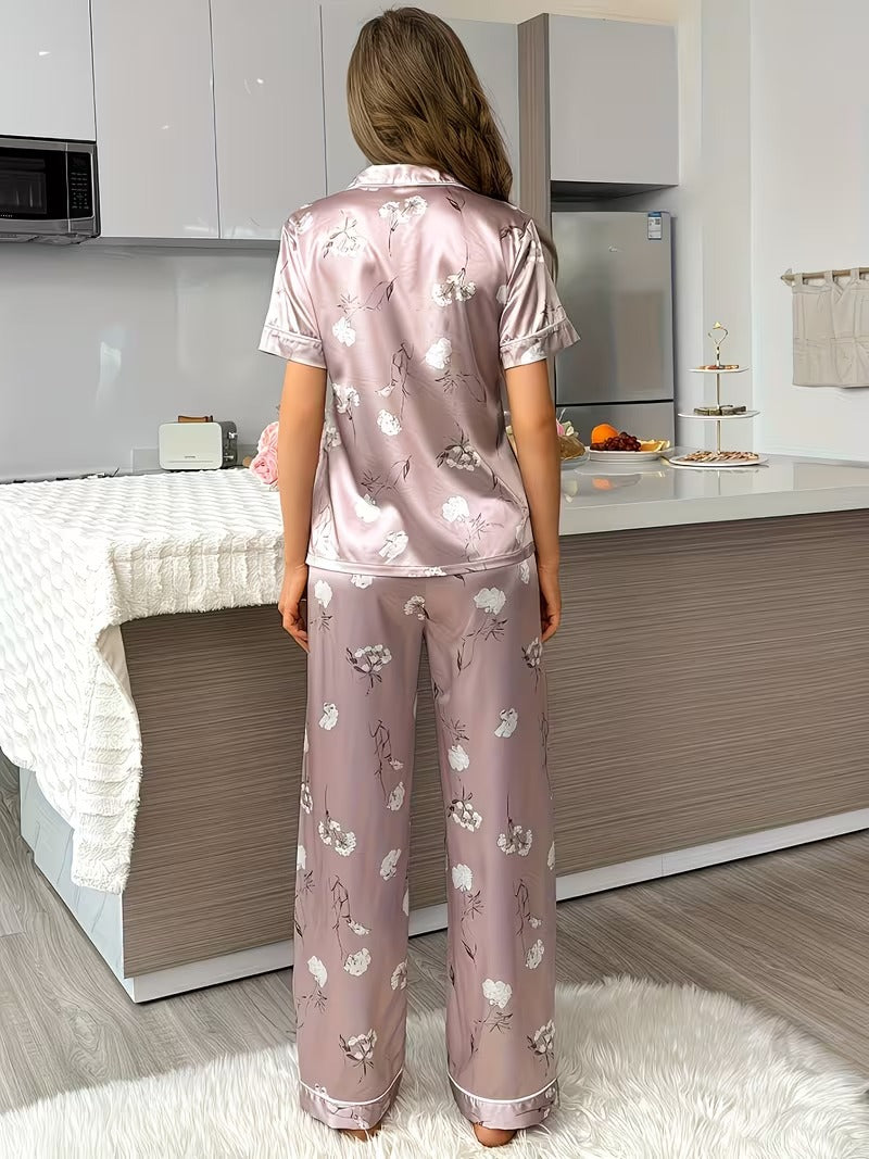 Experience effortless elegance with the Blush Rose Satin Pajama Set, designed for women who love comfort with a touch of luxury. Crafted from silky-smooth satin fabric, this two-piece set features a short-sleeve button-down top with delicate piping details and a matching pair of relaxed-fit pants.